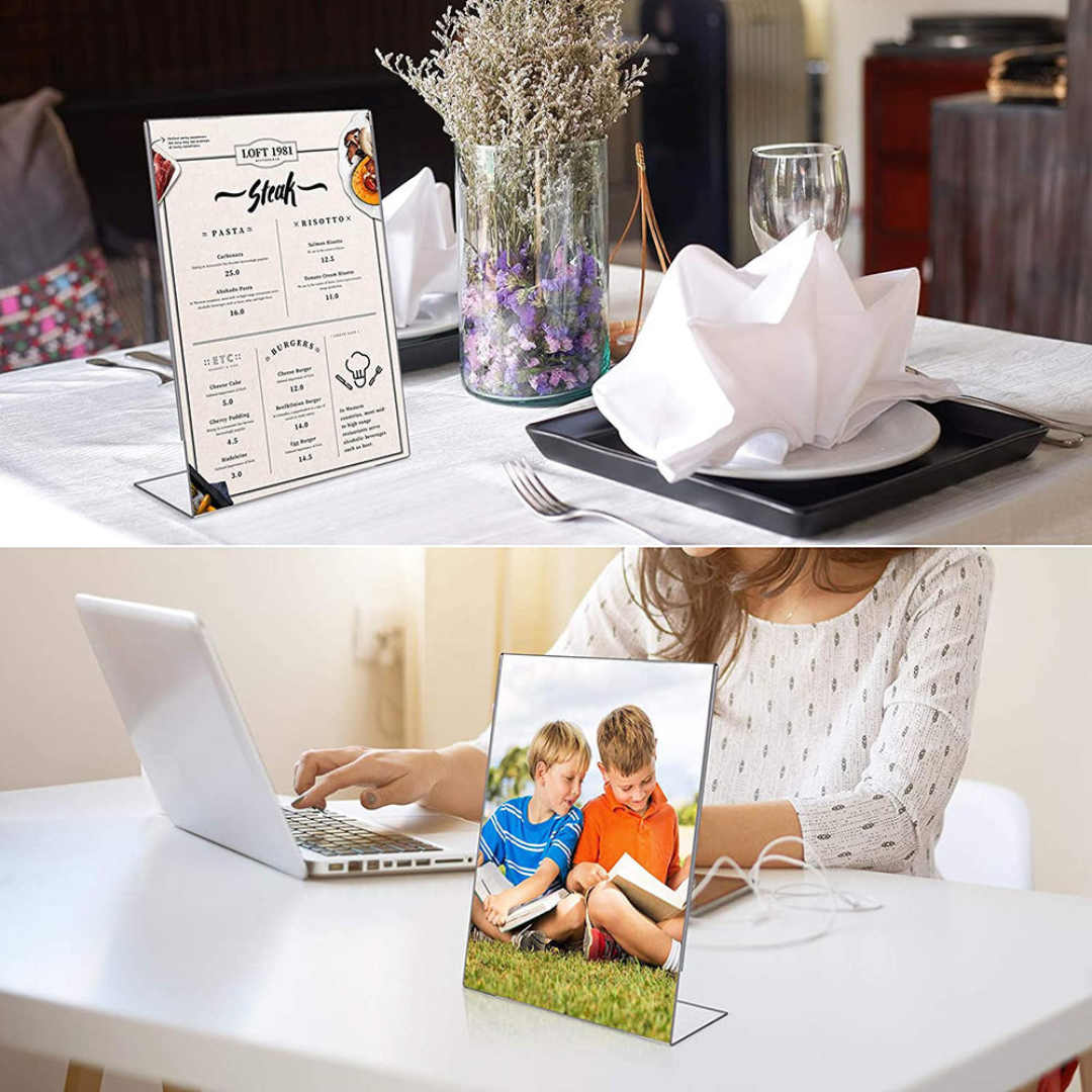 Optimal Viewing Angle: Designed with a slight slant, this A5 acrylic sign holder presents content at the perfect angle for easy reading, enhancing visibility and interaction in business environments, restaurants, or trade shows.